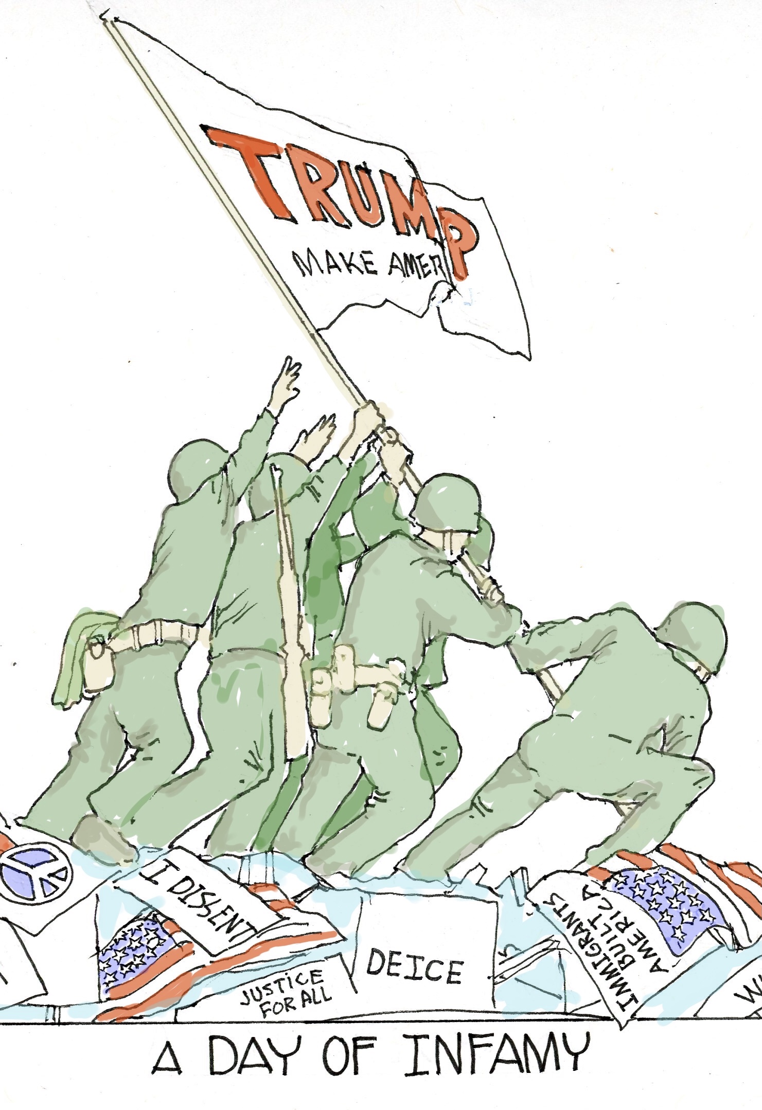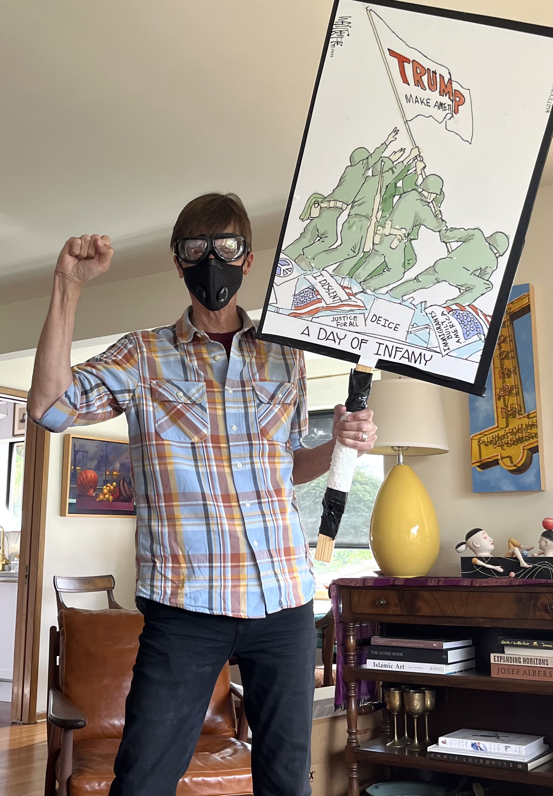 Certainly this was more timely, but due to a horizontal layout, the image came out reduced and less easy to read from a distance. To keep everyone happy I taped this over the Trump Flag toon so that, for certain privileged viewers I could I unclip and swing open the poster and reveal the Flag toon.