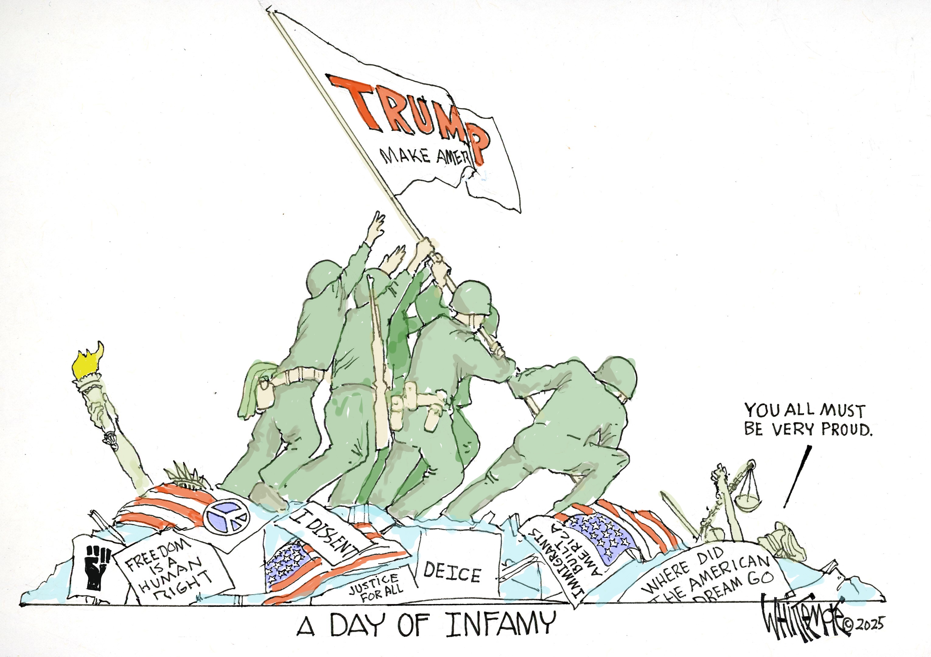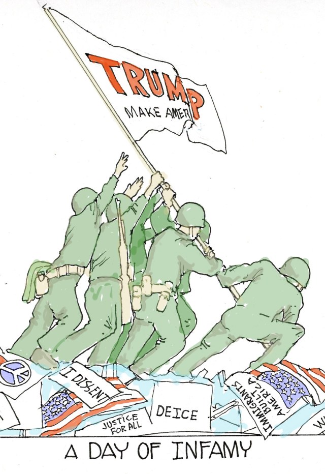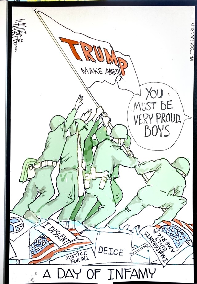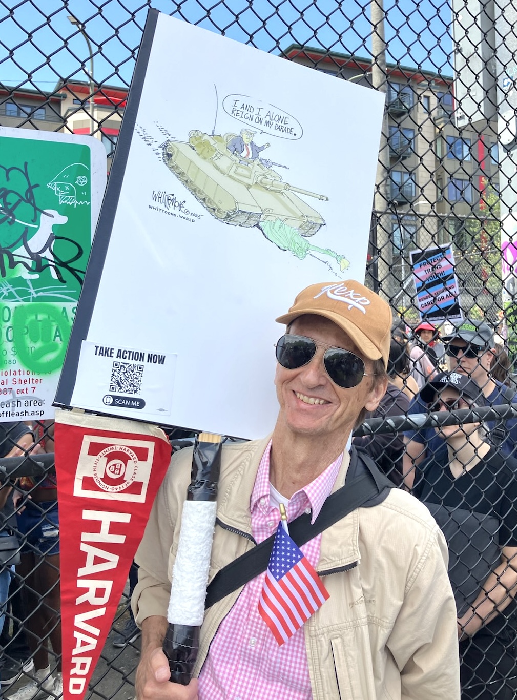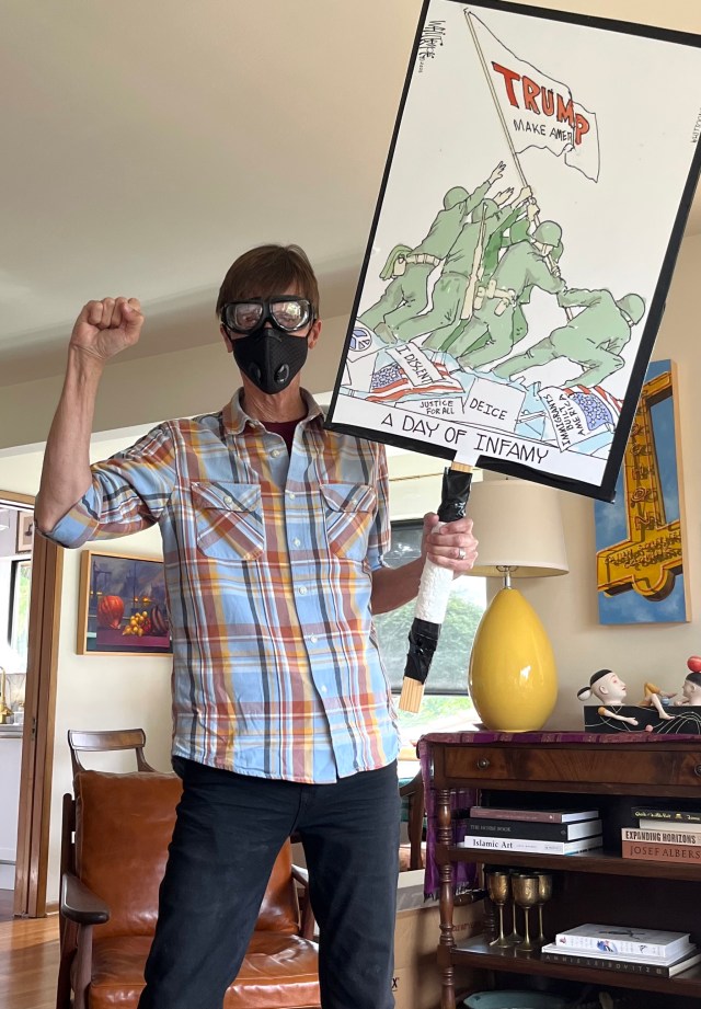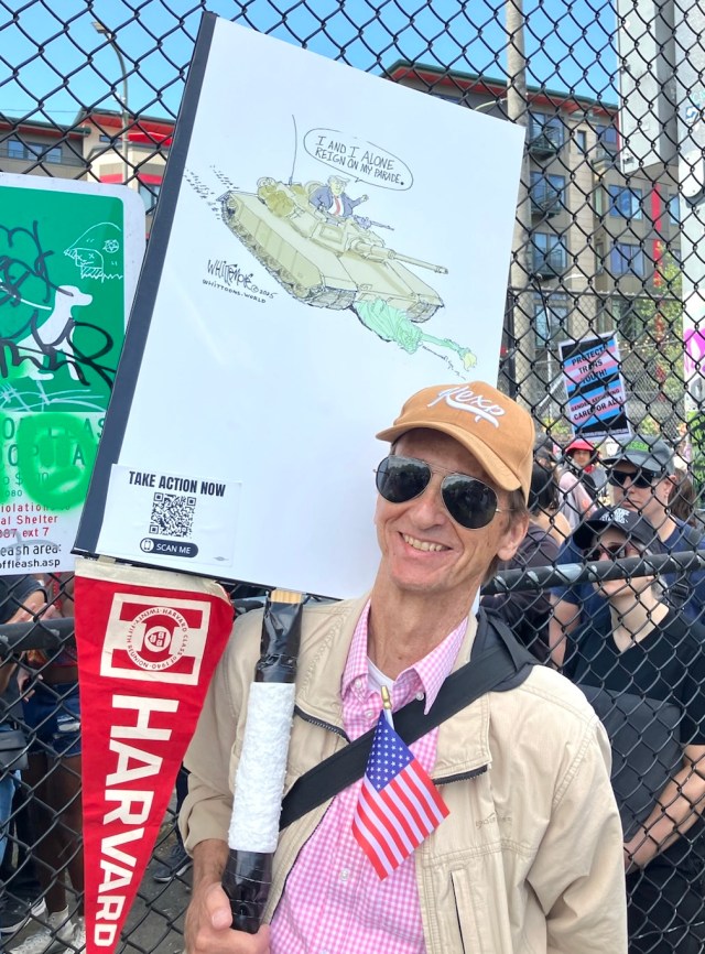 The cartoon blown up to the size of a poster by Walgreens was not my first choice for the No Kings Day. A couple of folks previewing my bold statements deemed one as too obscure, and might give the impression that I was supporting Trump. Oh, Come On…Reaally. The very nice lady at the Walgreen’s photo counter had given her stamp of approval. But I buckled under pressure and raced back to her for the last minute, day -of, printing.
