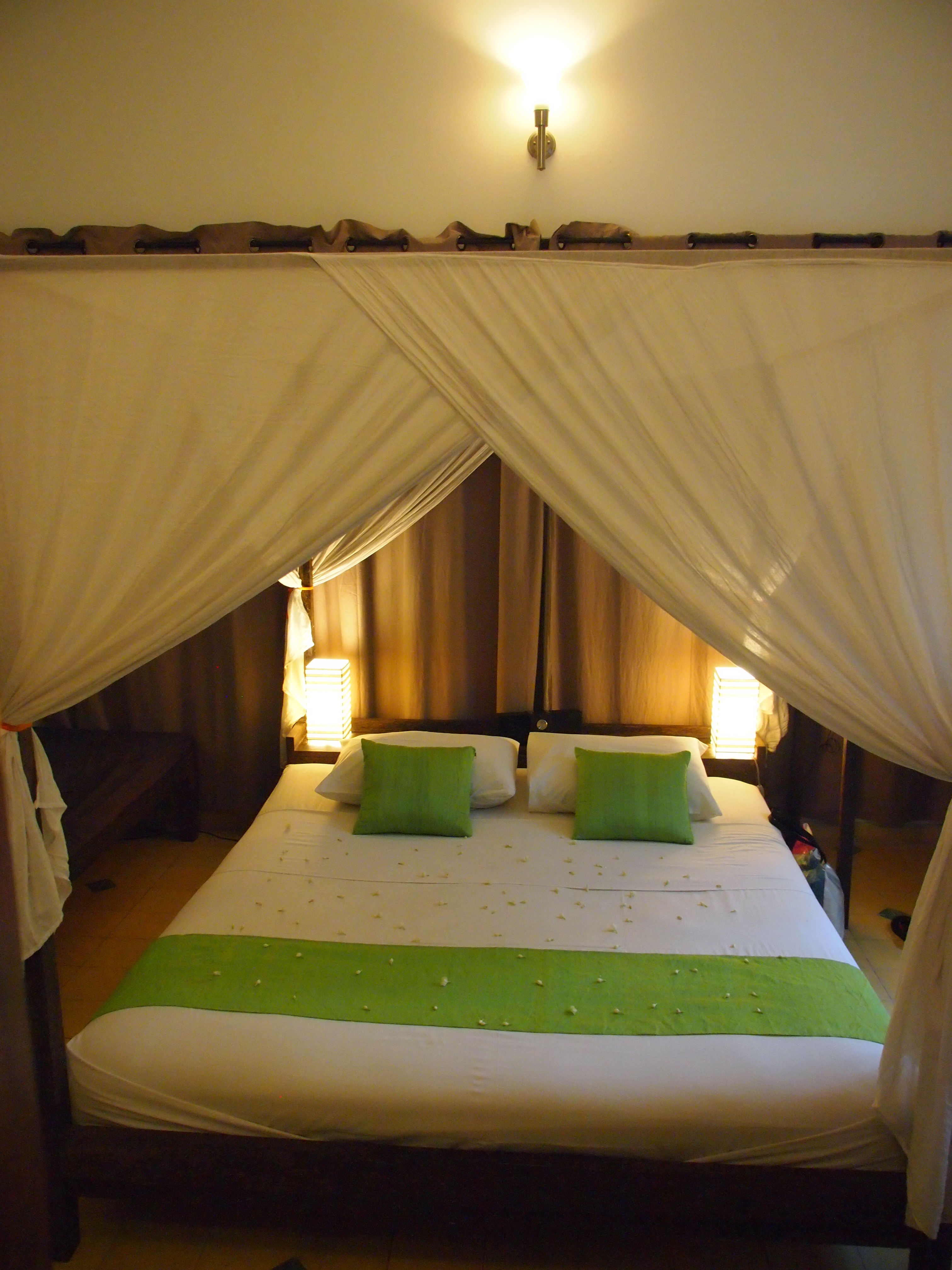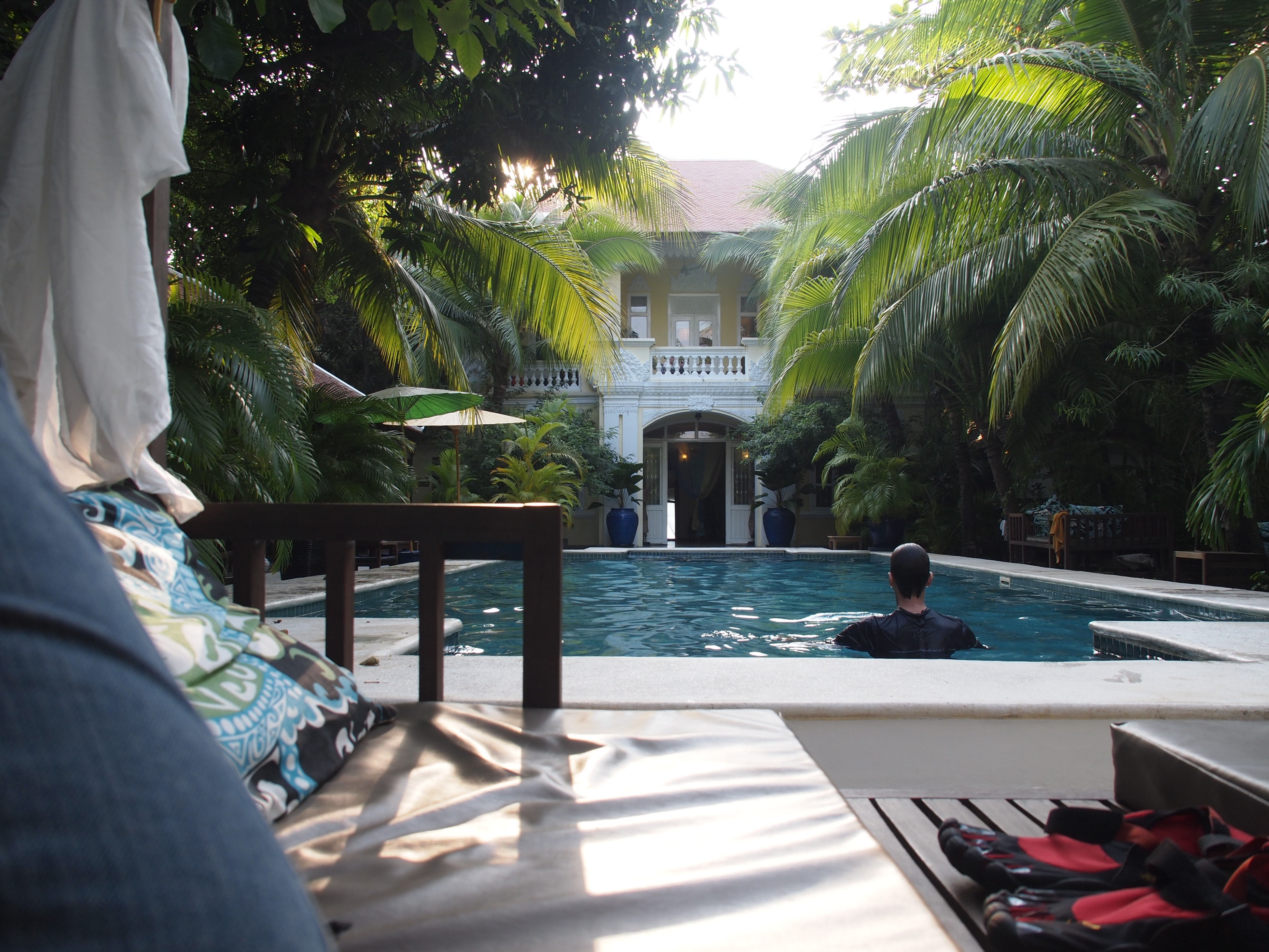 Arriving in Phnom Penh, I waved off the touts to collect my thoughts as Michele called the hotel to check on available transport. Within minutes a Jaguar XJ6 appeared, and we slide across leather seats into the lap of aging luxury right up to the gates of the Pavilion Hotel. Given the history of horror in this town, this was totally absurd. As an artificial oasis in a corrupt capital, we had invested in this hotel as a buffer from the harshness of unknown surroundings. I was planning on visiting a site of past atrocities… and this hotel was the retreat I might need to handle a dreadful awakening to another example of humanity’s cruelty. A large pool with cabanas was just steps away in our flip flops. We were “Swimming to Cambodia” using very different strokes.