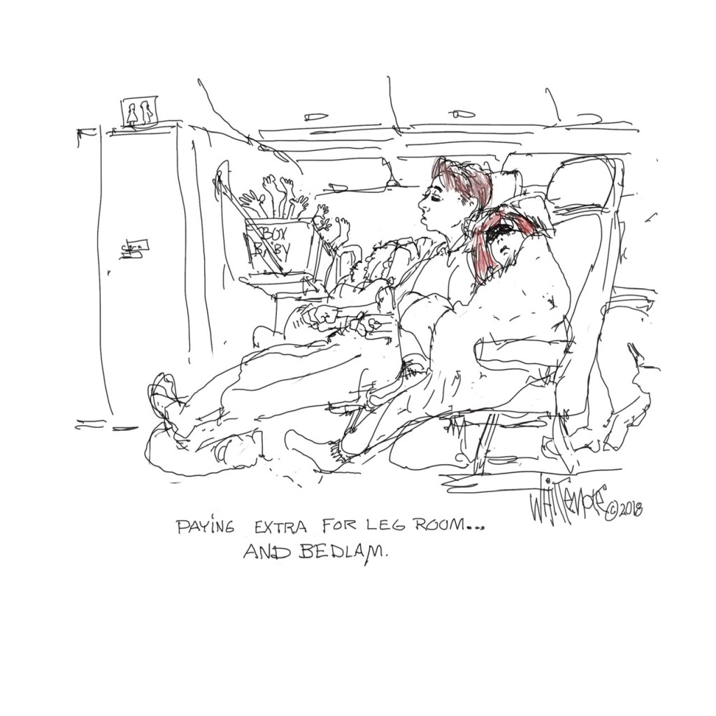 A little frazzled but no longer shaking with anxiety, we settled into our extra-leg room seats for which Michele had paid extra. Also settling in were two families with babies in the same row, facing a bulkhead. Screaming commenced immediately, and like a tag team, one child always seemed to pick up the battle cry where the other left off. As soon as we had liftoff, our headphones went on and a movie marathon looked to be the best option for maintaining sanity. Eventually the sweet bawling babies were strapped into flimsy sleeping boxes set on precarious drop-down shelves off the bulkhead…and they fought their way to sleep. The Sand Man cometh but not soon enough.